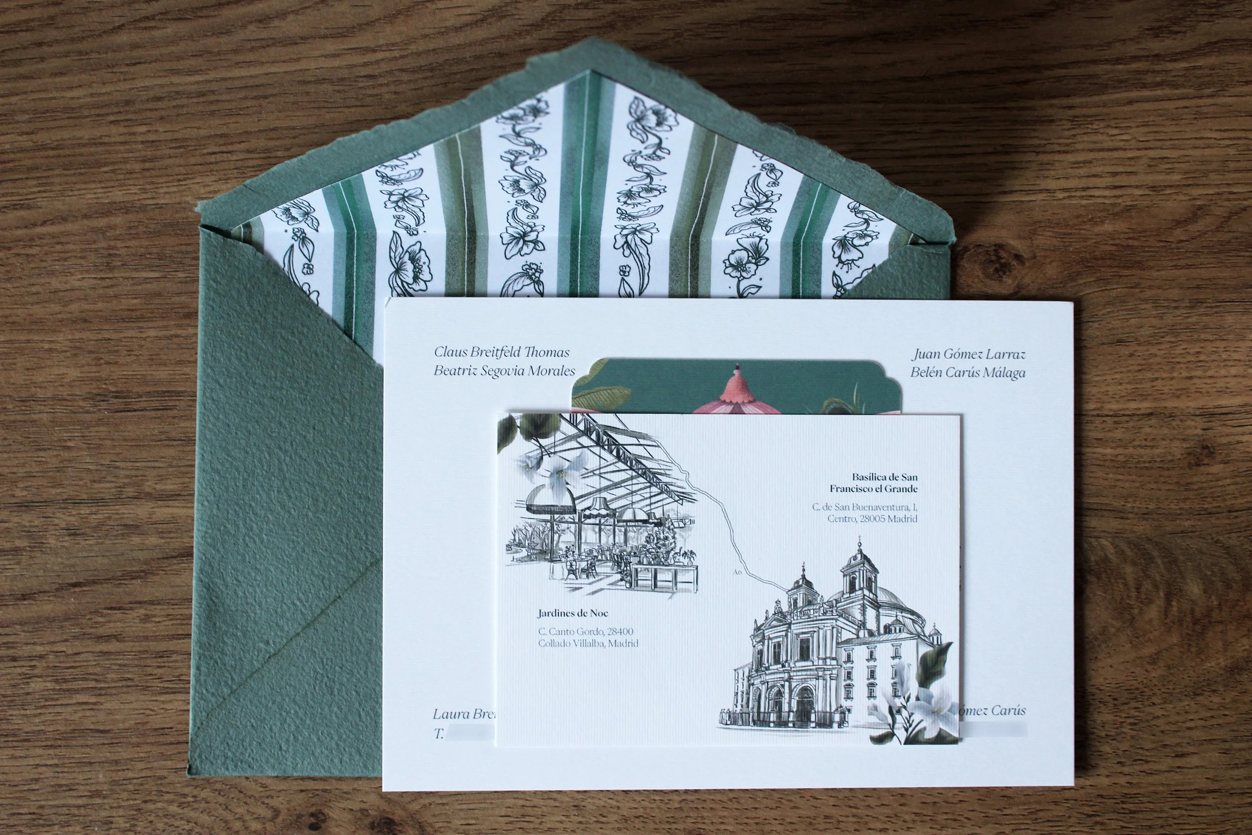 For our wedding invitations, I wanted to create something deeply personal, so I designed every element from scratch. I illustrated a custom map featuring the church and the venue where the ceremony and celebration will take place, making these locations the visual core of the piece.