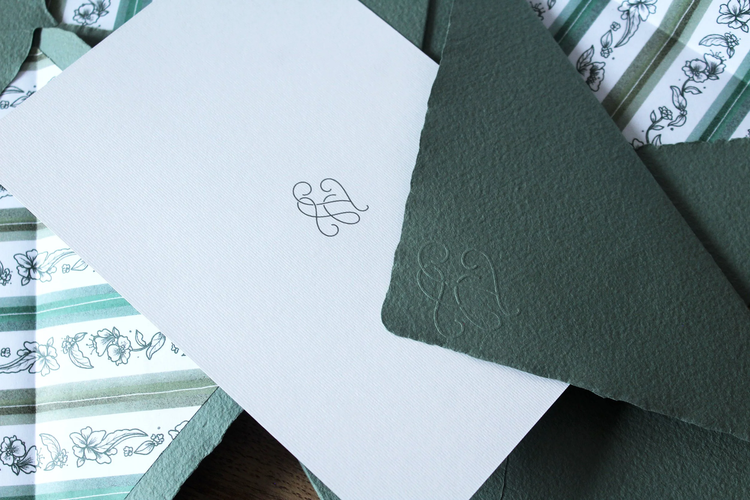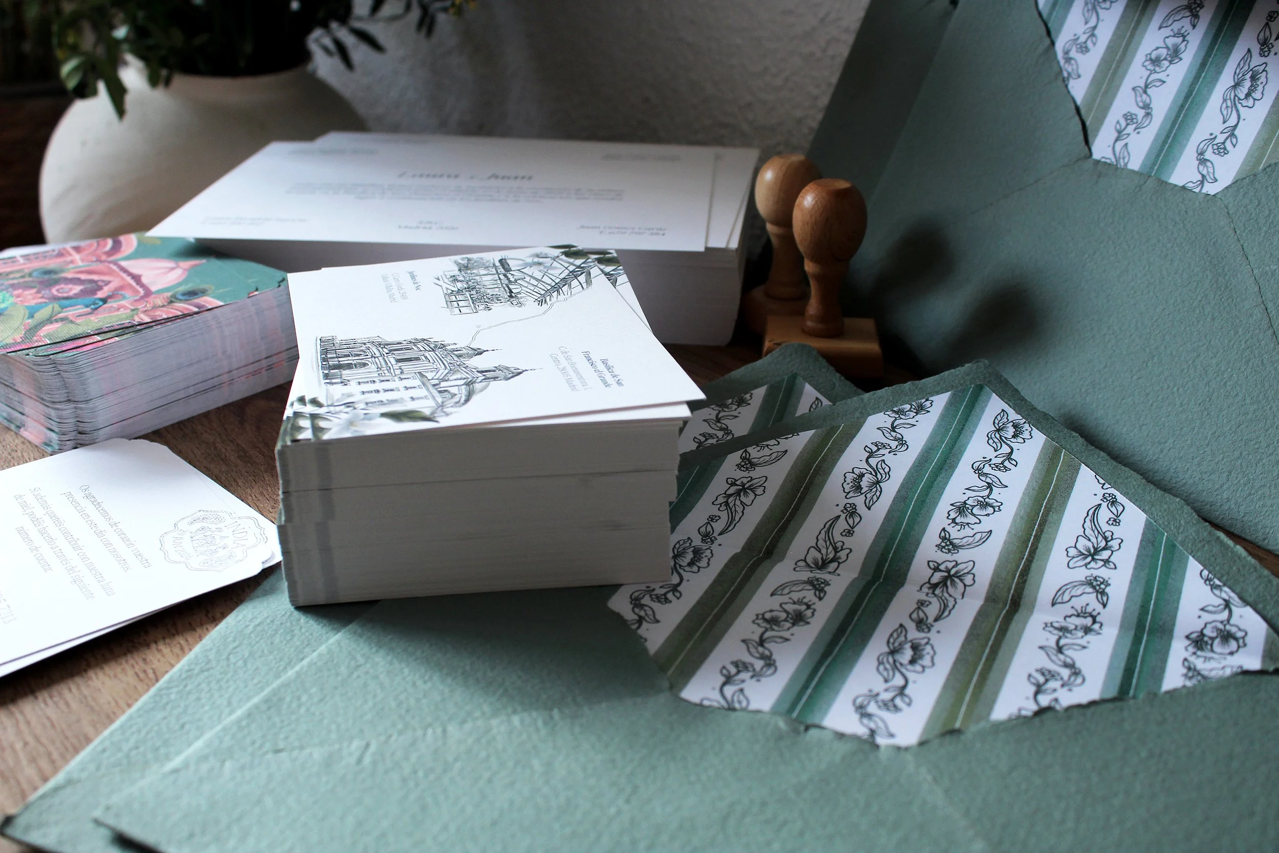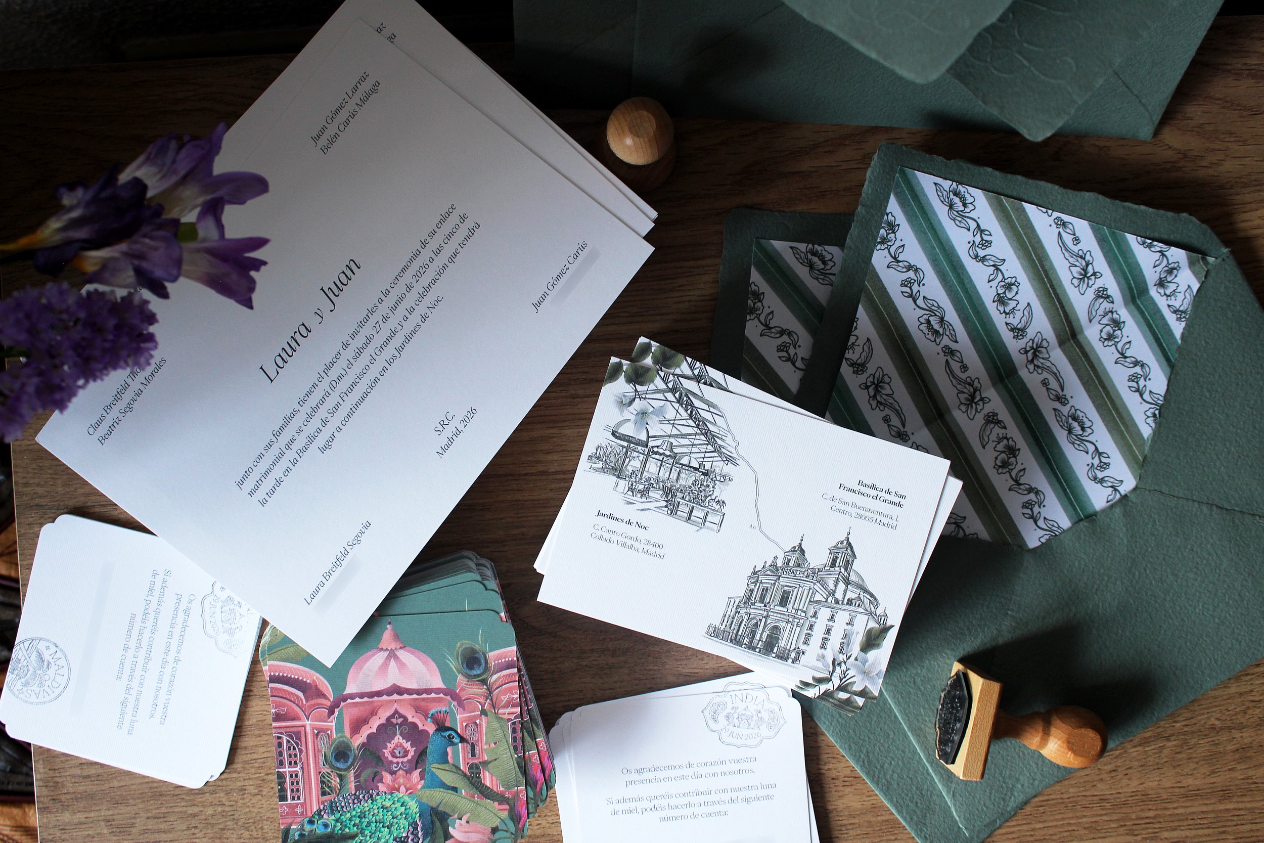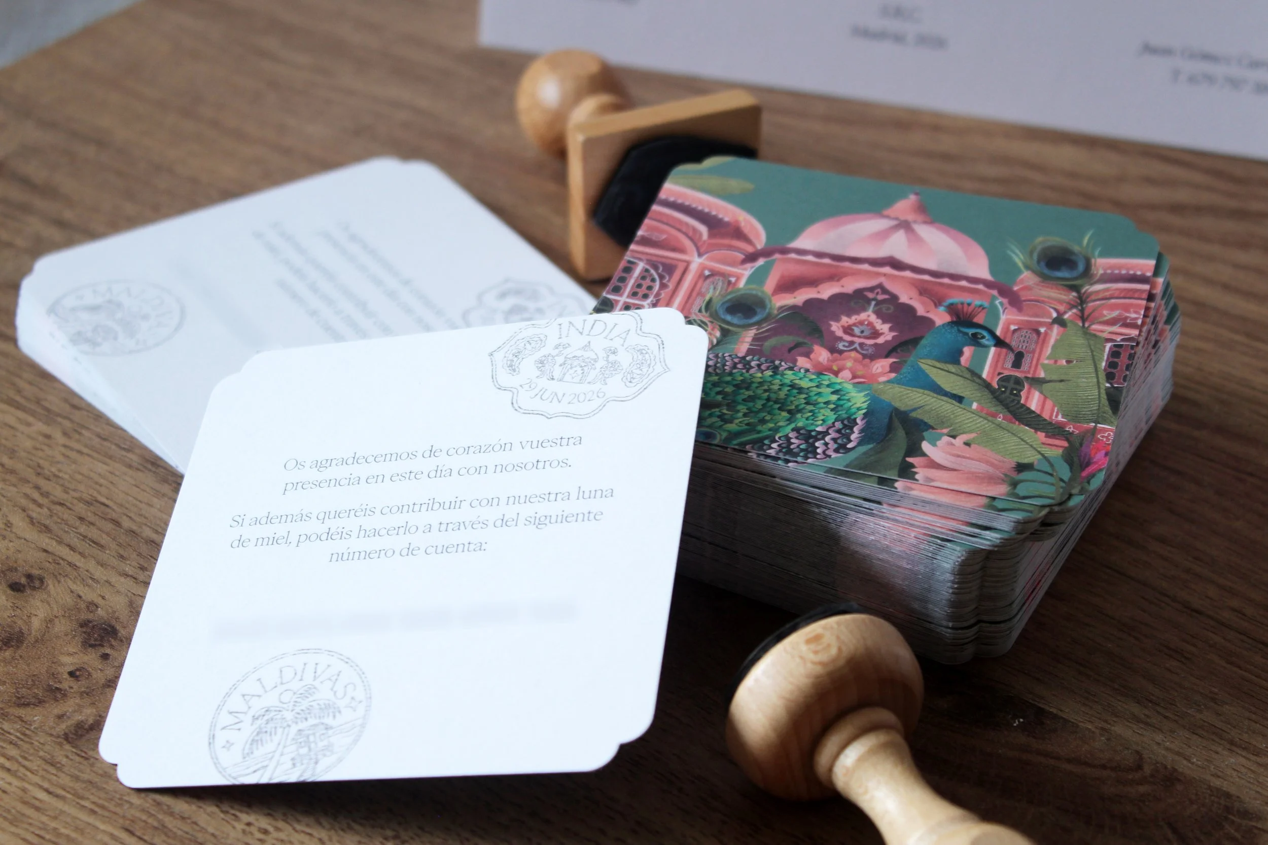 As our honeymoon will be in India and the Maldives, I also commissioned traditional stamps inspired by icons from both destinations. Each invitation is hand-stamped, so every piece is slightly different, adding a unique, handcrafted quality to each one.